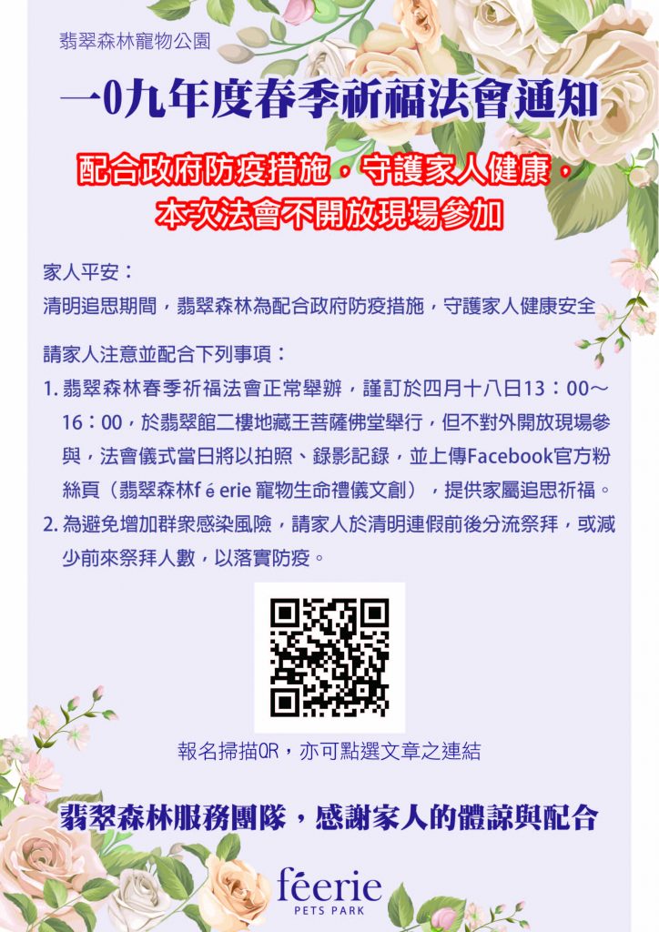 清明追思期間,翡翠森林為配合政府防疫措施,守護家人健康安全,請家人注意並配合下列事項: